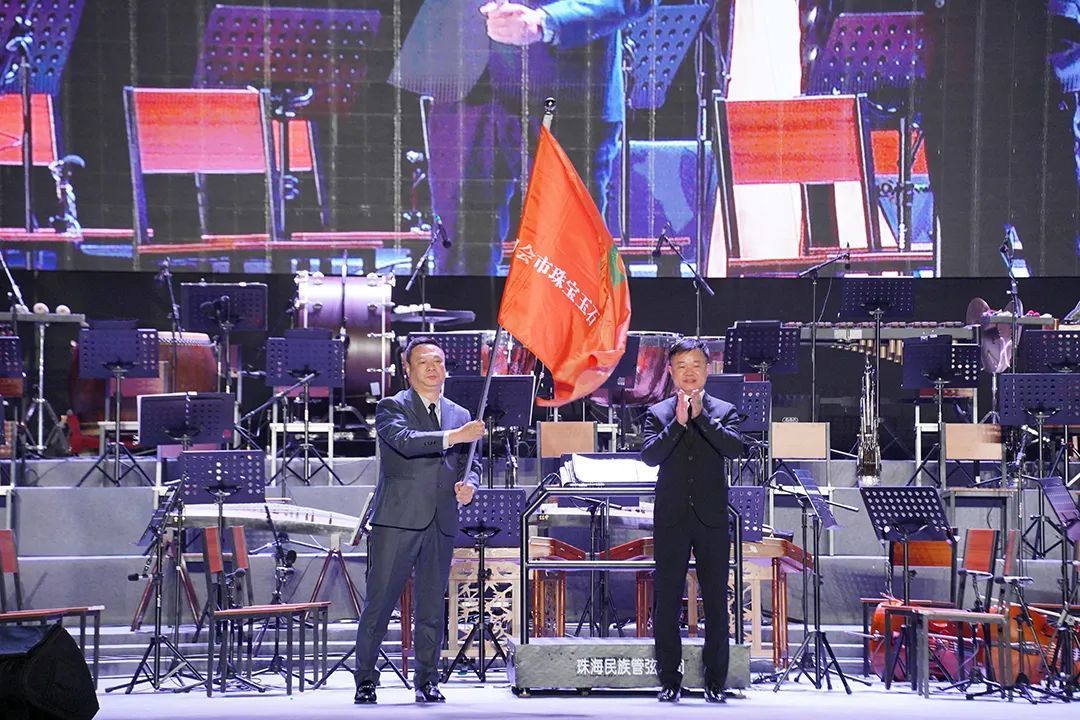 ▲四会市珠宝玉石首饰行业协会新老会长胡立华(右一)、罗荣俭(左一)交接会旗